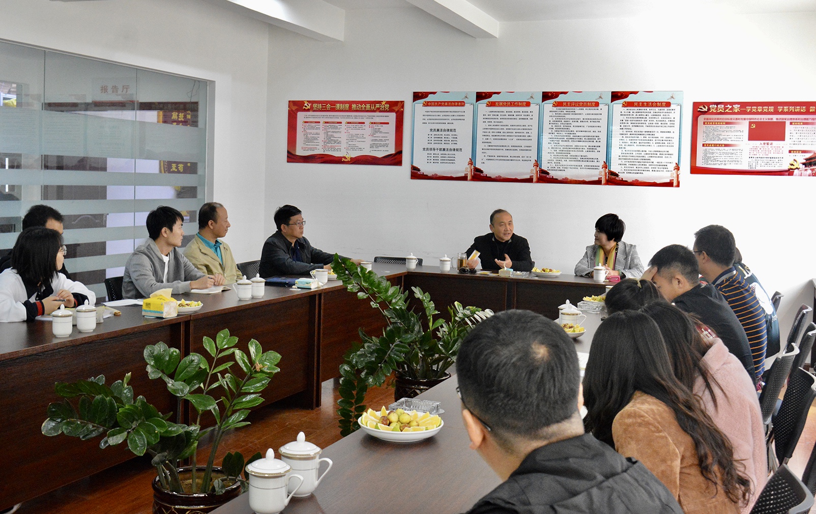 揭牌仪式结束后,周副校长与建筑学院一行领导在麦普公司党建活动室,与麦普公司领导及公司党支部支委及全体党员开展了座谈交流,围绕“不忘初心,牢记使命”主题教育及今后建筑学院城乡规划教工党支部与麦普公司党支部之间如何开展校企党建联建活动,进一步丰富支部活动和学习的内涵及形式,进行了深入的探讨。