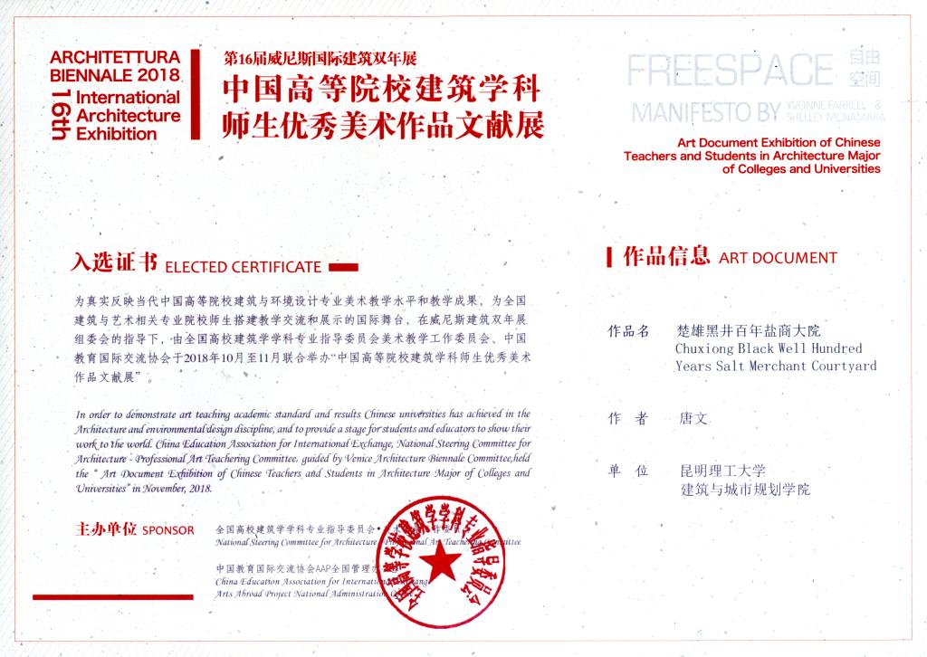 此次优秀美术作品文献展是本届威尼斯国际建筑双年展的重要组成部分,得到了威尼斯双年展组委会和威尼斯国际大学联盟的支持。本次展览是继在上届2016年威尼斯国际建筑双年展期间成功举办后的第二次,全国共有一百多所设有建筑与环境设计专业的院校参加,评选委员会由来自清华大学、中央美术学院、同济大学等国内院校及意大利的专家教授组成,本着公平、公正、公开的原则,经过评选,共有来自全国各地71所建筑与设计院校的43件教师优秀作品和67件学生优秀作品入选。
