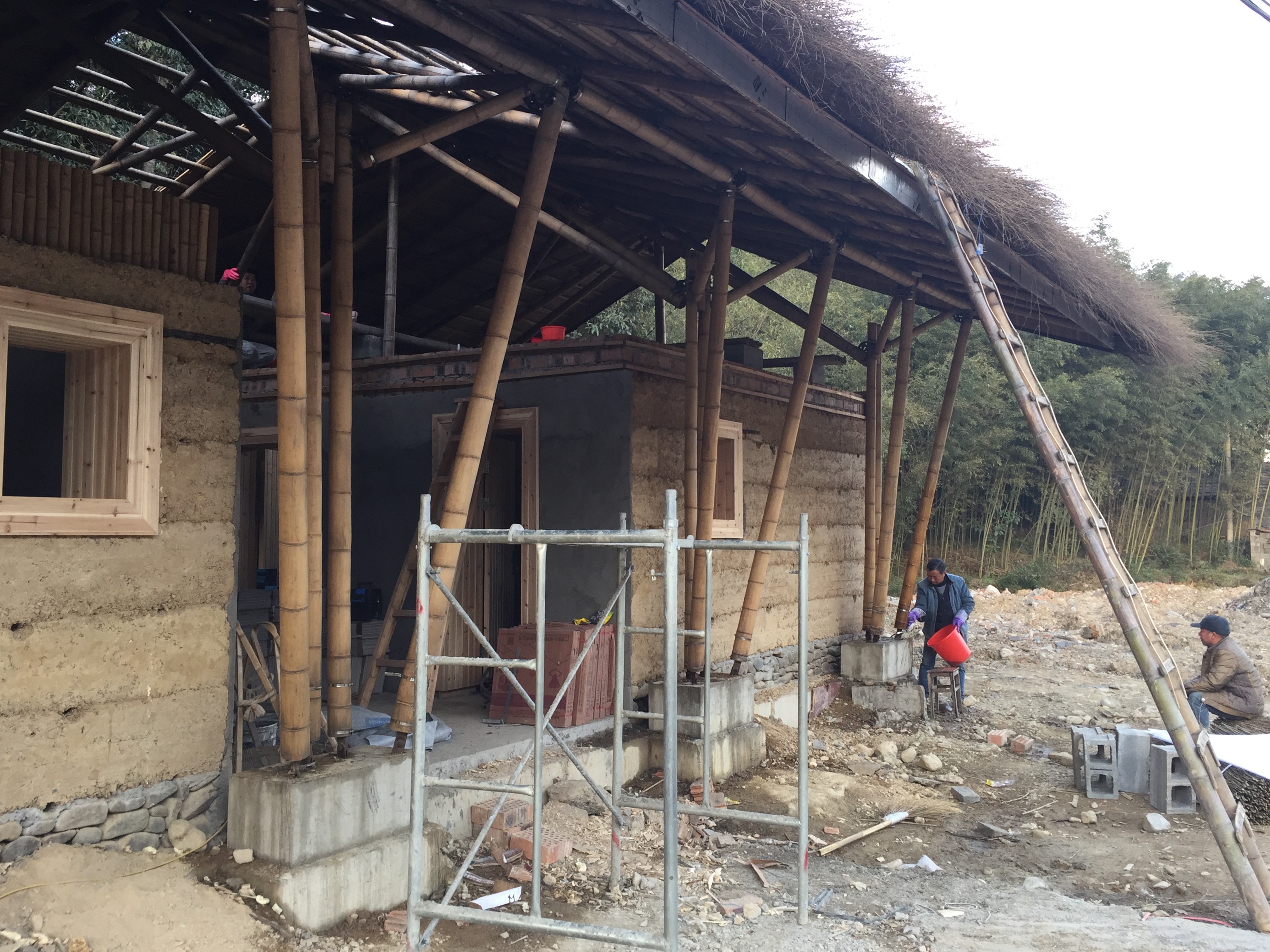 不少团队还希望探索如何通过作品的实用性,来提高乡村基础设施和生活环境。在“厕所革命”如火如荼的今天,两座乡野间的新型公厕格外引人注目。在孝丰镇潴口溪村,二座高大的创意建筑掩映在树影之间:深圳大学的作品 “天空茅房”赋予了乡村厕所更多设计感,以竹子穿插而成的三维竹幕墙通透、轻盈,既保证了厕所的通风,又与周围周围环境融为一体;昆明理工大学的大竹旅游公厕,则还原了古朴的夯土结构,竹子伸向天空,构成屋架,土,锚固大地,形成墙体,形成“轻”与“重”、“天空”与“大地”的对话。