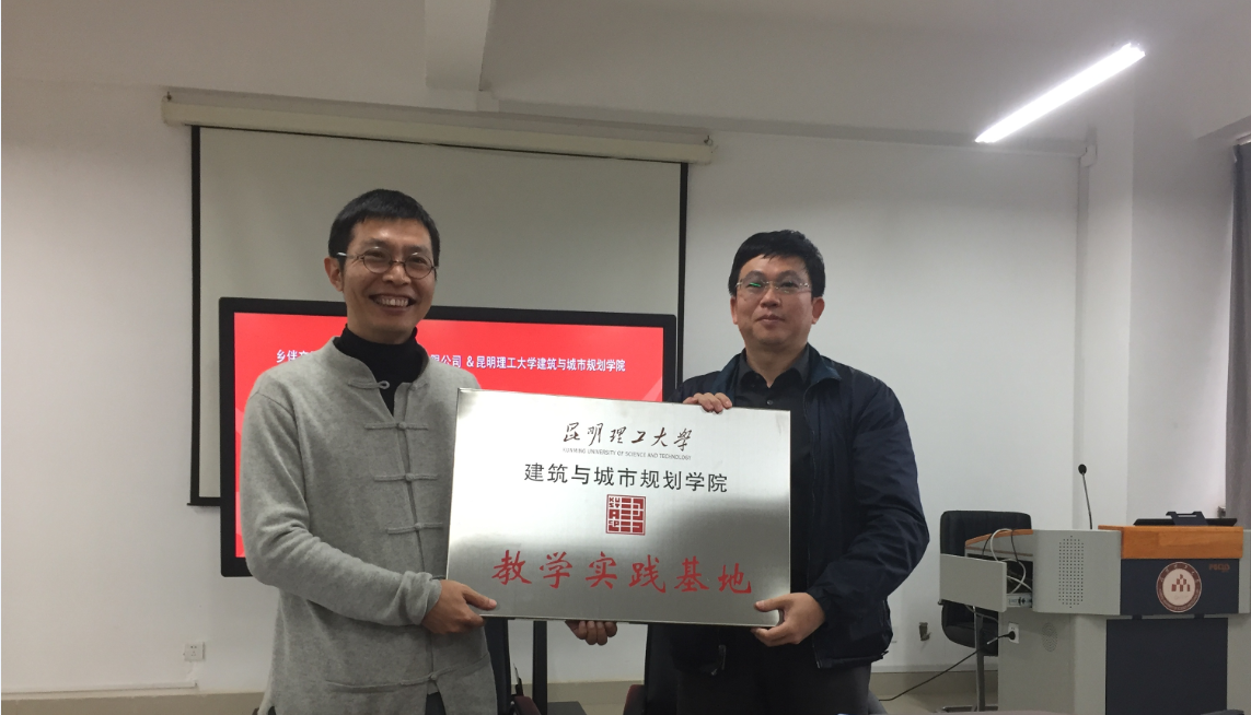 合作协议签订仪式结束后,举行了聘请该集团负责人、昆工校友朱胜萱为建筑学院客座教授的证书颁发仪式及教学实践基地授匾仪式。