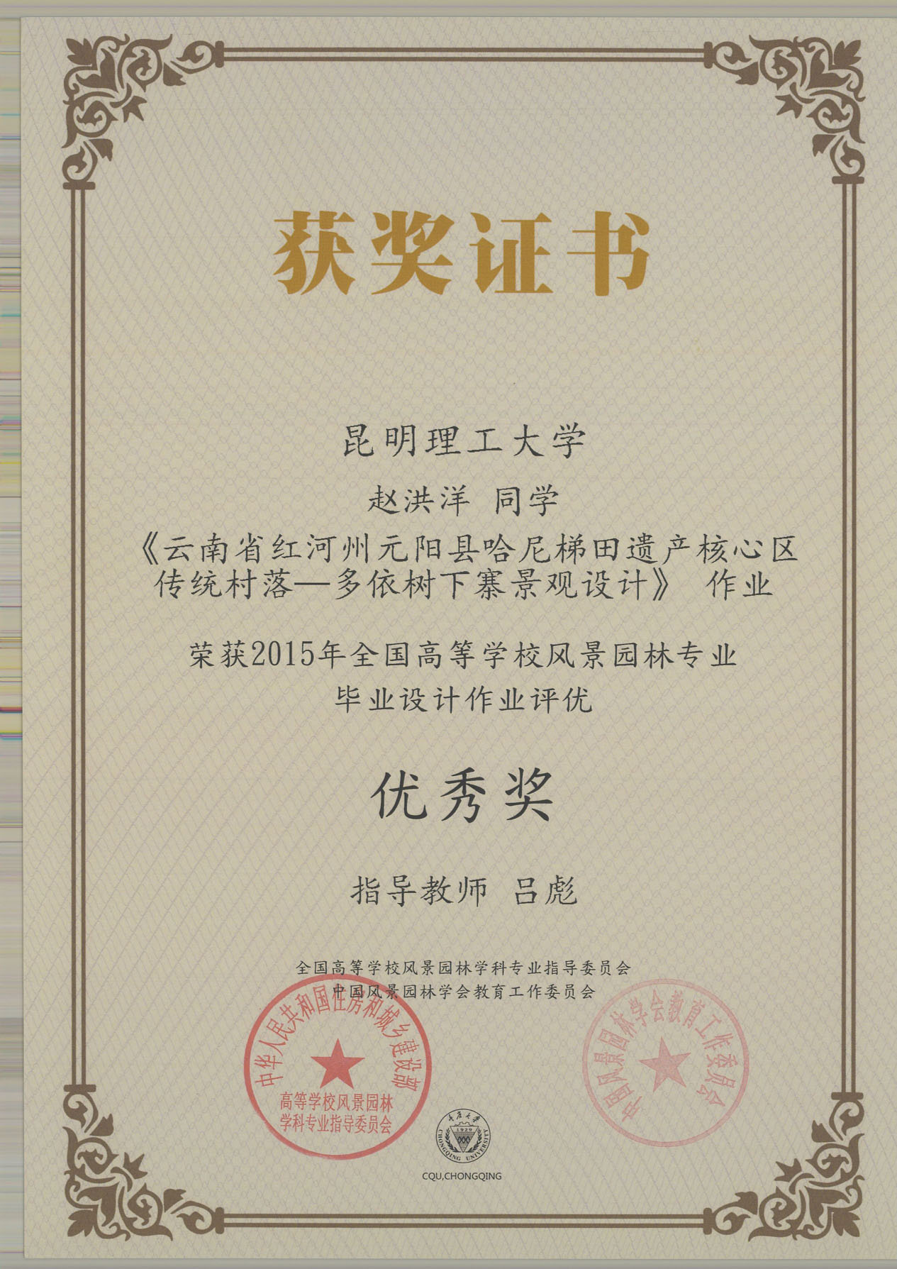 从2010级风景园林专业毕业生(第一届毕业生)中选送了三份作业参加评选,其中一份入选并获得优秀作业奖,作品名称:《云南省红河州元阳县哈尼梯田遗产核心区传统村落--多依树下寨景观设计》(获奖同学:2010级风景园林专业赵洪洋,指导教师:吕彪)。