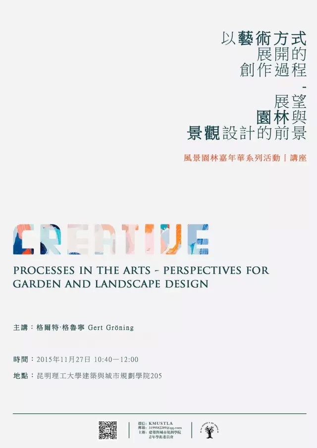 风景园林系策划承办的多元文化艺术活动。本期首届活动将藉由德国柏林艺术大学著名教授格尔特·格鲁宁教授访问色花堂